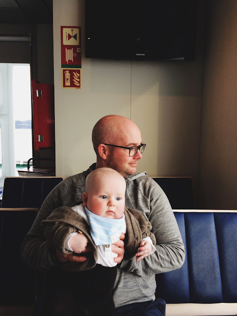 on the ferry // Sverre was too busy looking up through the window to nurse // Sara had not yet vomited from coughing (that she did during our brief stop in Bergen) // Sølve was on the phone working // I was happy that the road trip was going so well so far // in fact it was a very good first road trip as a family of four - even though Sverre made it perfectly clear during the last hour of driving that he was not at all interested in being in the car anymore