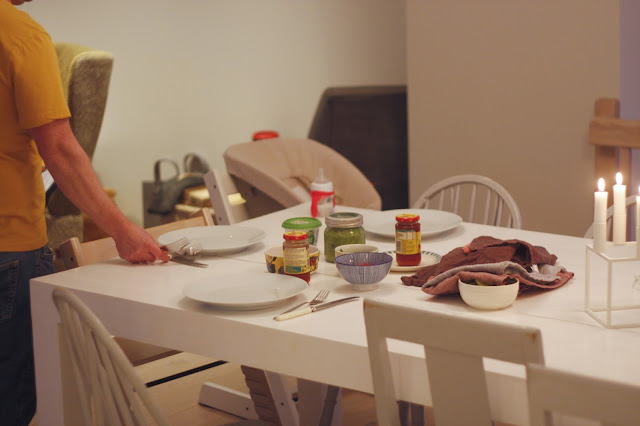 While I took the kids downstairs for a bath, Sølve prepared dinner. Tacos, on Sara's request. The homemade spinach kale pesto worked surprisingly well.