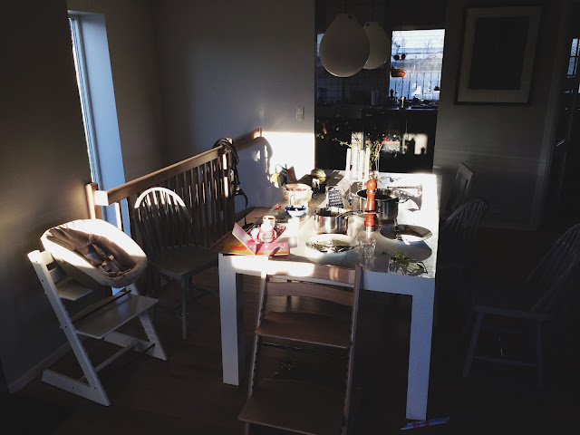 The last couple of nights have been hard because of Sverre's cold. I'm preparing for another one of those by going to bed before 9 pm, leaving behind this mess and beautiful evening light.